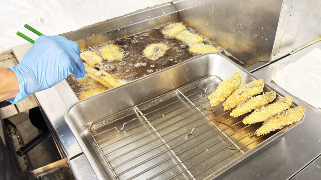 また、鯵酢〆や鯵の南蛮漬、鯵のフライなど、鯵の魅力を余すところなく引き出す多彩な味わいが揃いました。特に鯵のフライは、サクッとした衣の中から旨みがじゅわっと広がります。厨房では丁寧に揚げる工程が進められ、その瞬間を見ているだけで食欲がそそられます。