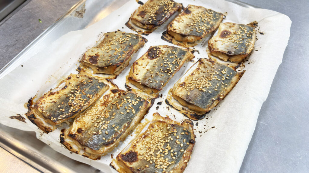 特製の味噌と胡麻のソースでオーブンでじっくり焼き上げた「利休焼き」は茶道の千利休に由来する料理法で、胡麻と味噌の風味豊かな一品です。