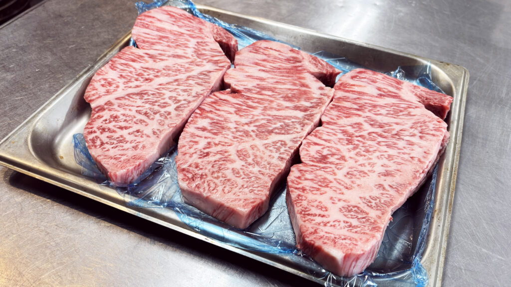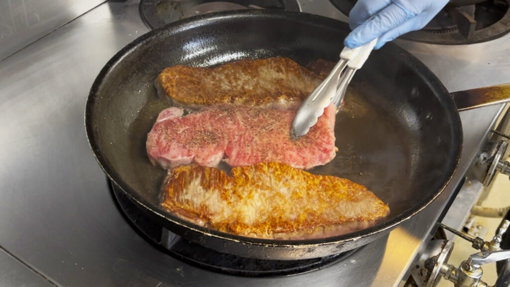 そしてメインの「黒毛和牛のグリル 春菊と松の実のペルシアード」には、今回は上質な黒毛和牛のサーロインを使用。
