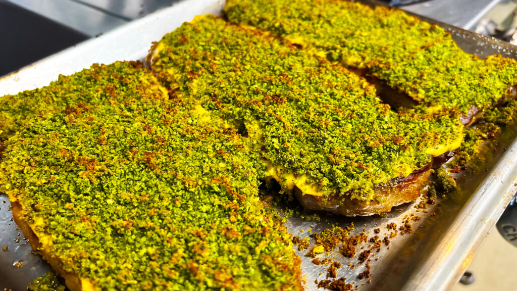 その上に、ローストしたニンニクと松の実、パン粉、そして春菊をミキサーでなめらかに仕上げた特製ペルシアードをのせ、オーブンで香ばしく焼き上げていきます。