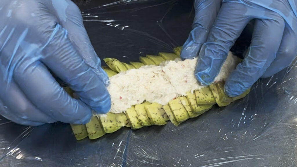 この料理では、薄くスライスしたアボカドに、蟹の身とクリームチーズ、レモン汁を加えて塩胡椒で味を整えたタルタルをのせ、ラップで丁寧に巻いて筒状にすることで、見た目も美しい一品に仕上げていきます。
