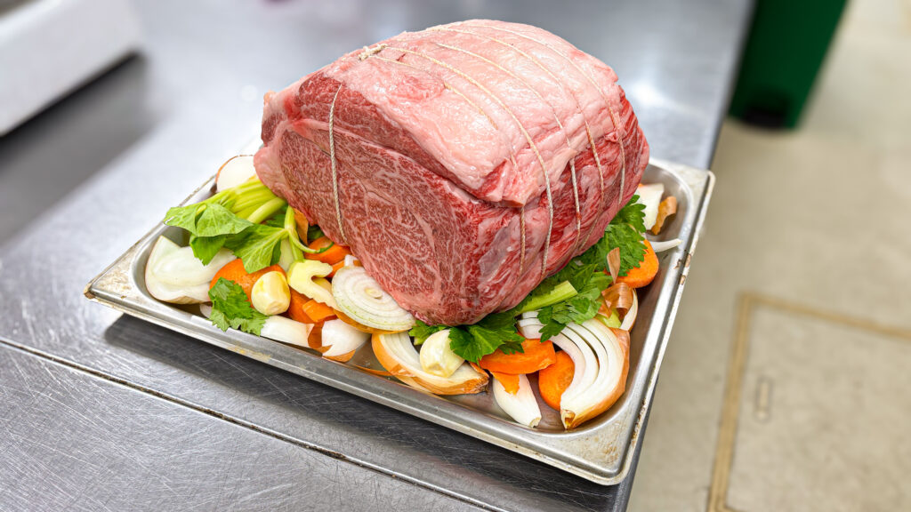 香り付けの野菜と一緒にオーブンで約2時間かけてじっくり焼き上げ、焼いた後は同じ時間アルミホイルに包んで休ませます。