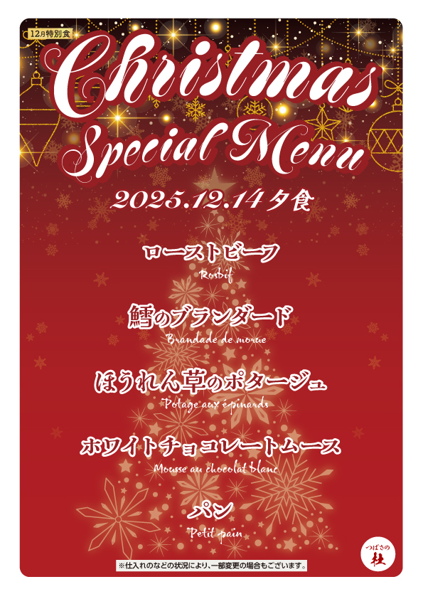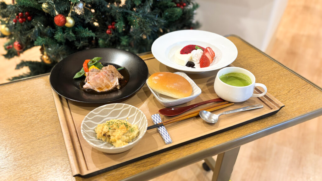 ご入居者の皆さまからは、「クリスマスを感じるコースでとても美味しいわ」「ローストビーフがあるなら赤ワインも一緒にほしいな」といった声も聞かれ、クリスマスらしい特別なひとときを楽しんでいただけたようです。