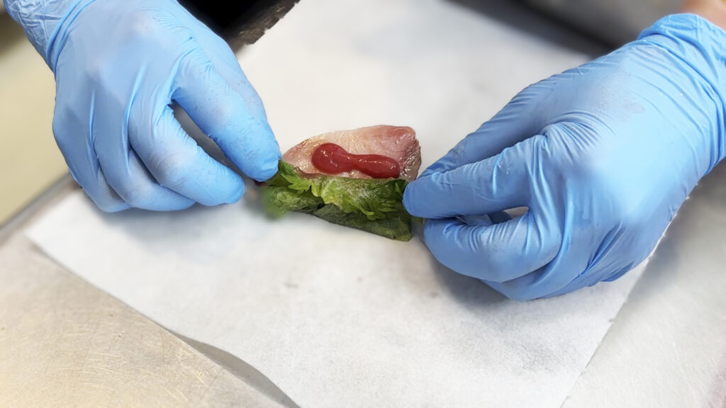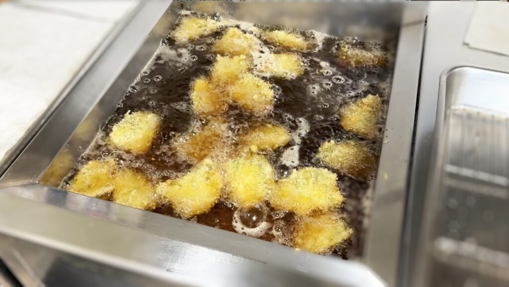 「鰤の香梅ふらい -割りそうす-」は、鰤を梅と大葉で包んでからフライにした一品。サクッとした衣の中から、梅の酸味と大葉の香りがふわっと広がります。厨房スタッフの技が光るこだわりの料理です。
