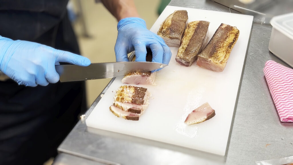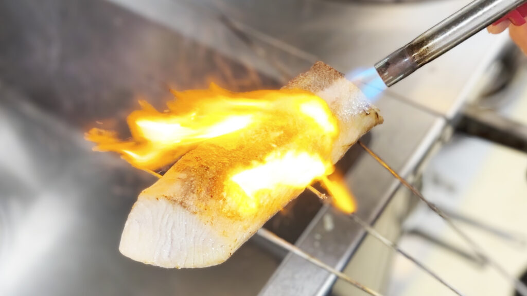 表面をバーナーで丁寧に炙ることで、外側は香ばしく、中はレアな状態に仕上げています。炙ることで鰤の脂がじゅわっと溶け出し、芳醇な香りが食欲をそそる一品です。