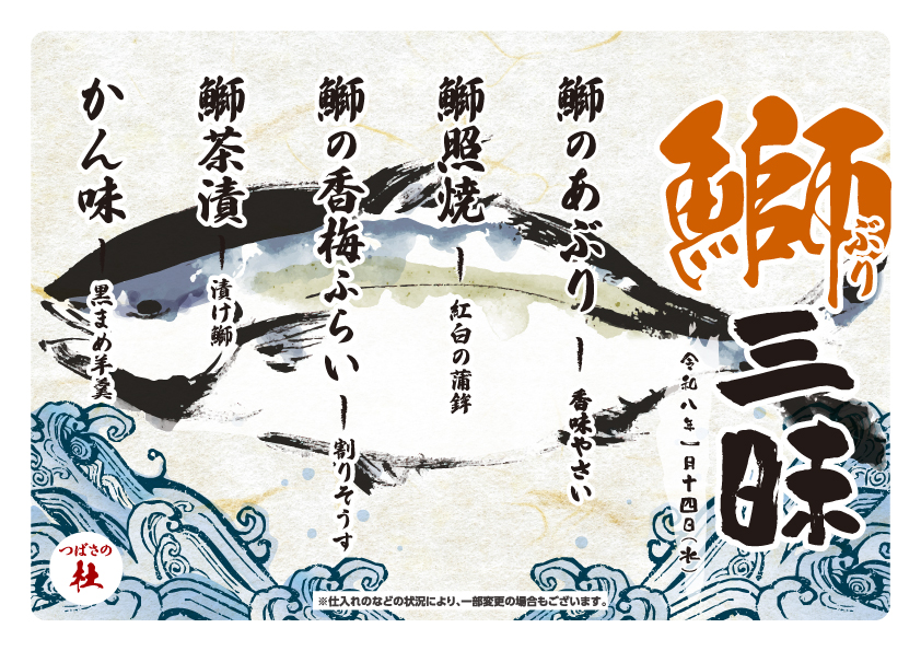 今回の特別料理は、冬の味覚「鰤(ぶり)」をテーマにした「鰤三昧」をご用意いたしました。