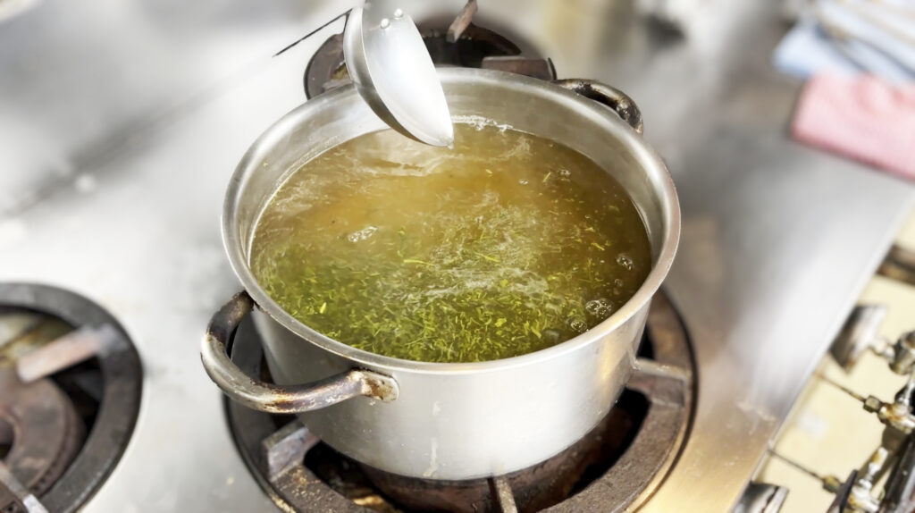鰹出汁を沸騰させてカルキを飛ばした後、85℃くらいまで温度を落としてからお茶っ葉を入れるという、職人こだわりの茶出汁をご用意。