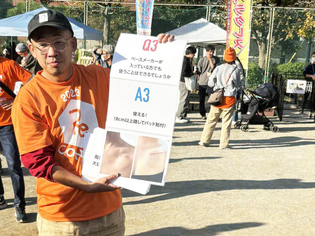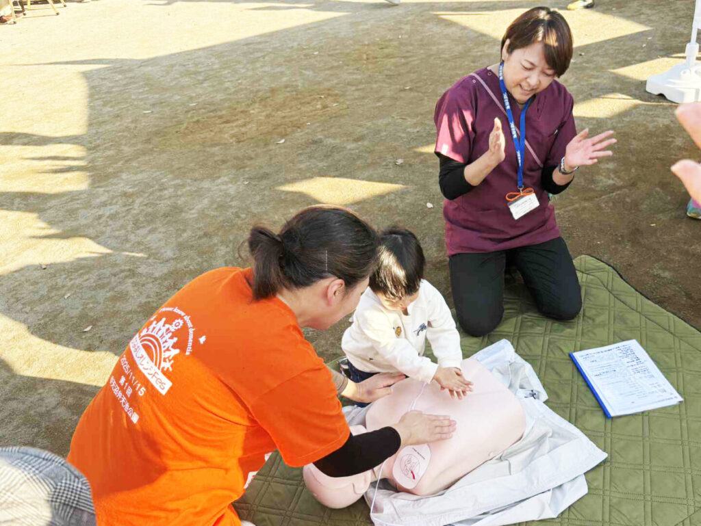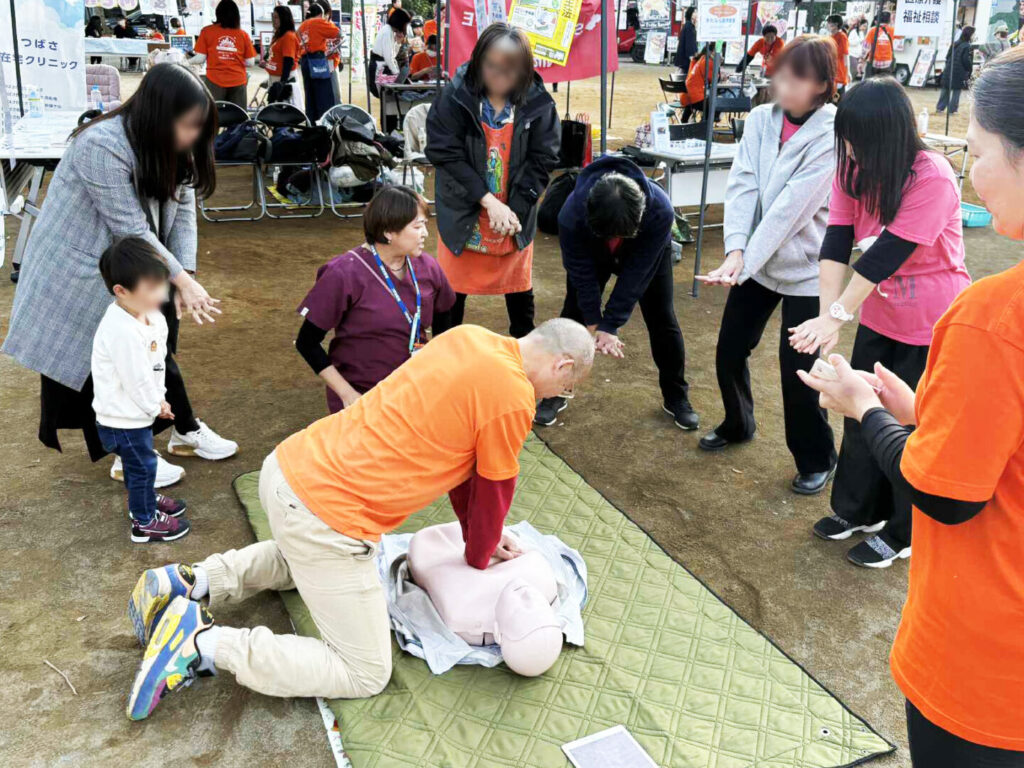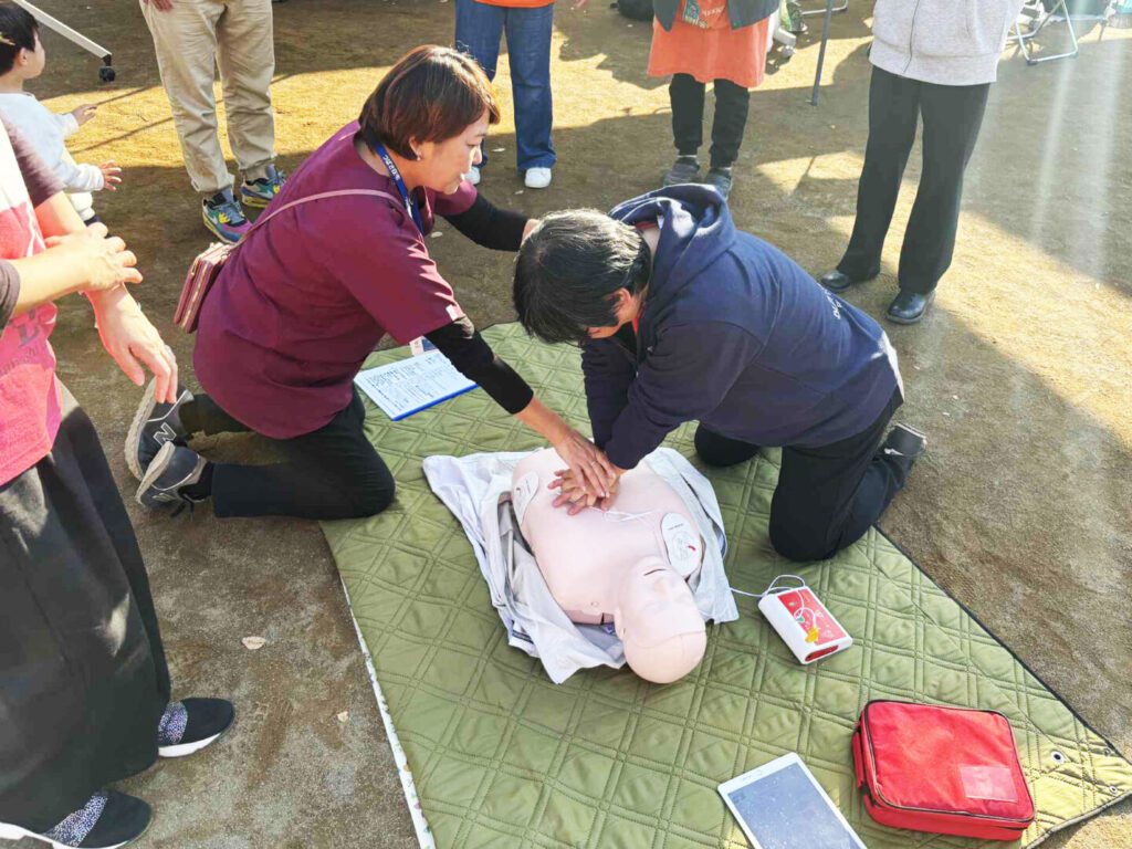 当日は、医療法人としての専門性を活かし、心肺蘇生法(胸骨圧迫)とAEDの使い方の実演・体験に加え、心肺蘇生法とAEDに関するクイズも実施。
