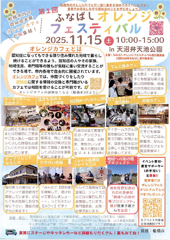 「オレンジフェスティバル」は今回が初開催となり、船橋市において認知症になっても、住み慣れた地域で安心して暮らし続けられるようにとの思いから企画され、認知症の方やご家族、地域住民の皆さま、支援に携わる専門職など、どなたでも気軽に集い交流できる場「オレンジカフェ」が一堂に会するイベントです。