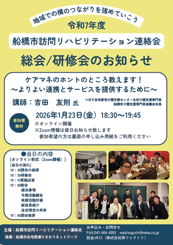 2026年1月23日(金)、当法人 つばさ在宅居宅介護支援センター吉田友則が、船橋市訪問リハビリテーション連絡会の研修にてお話しする機会をいただきました。